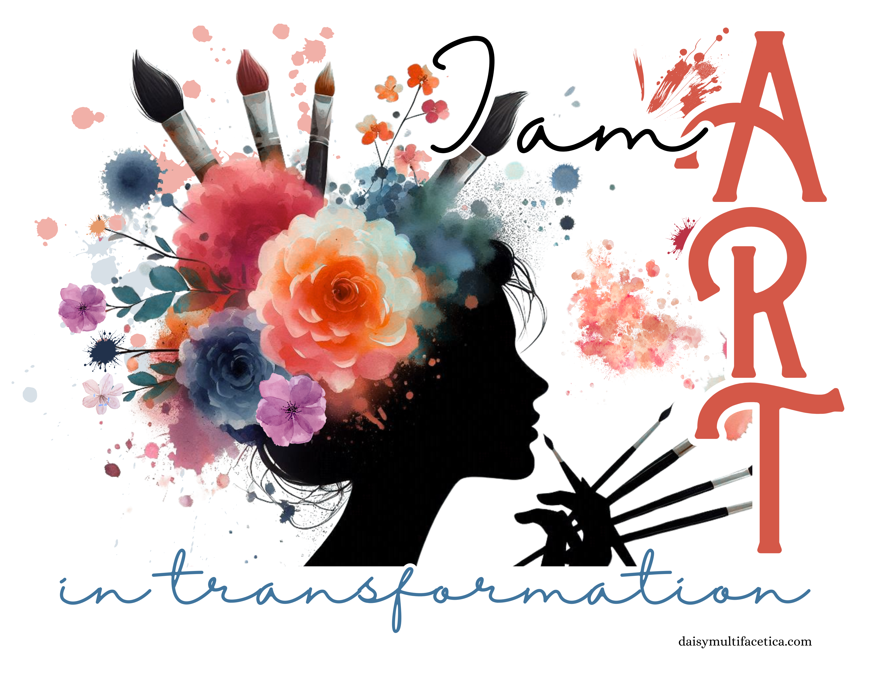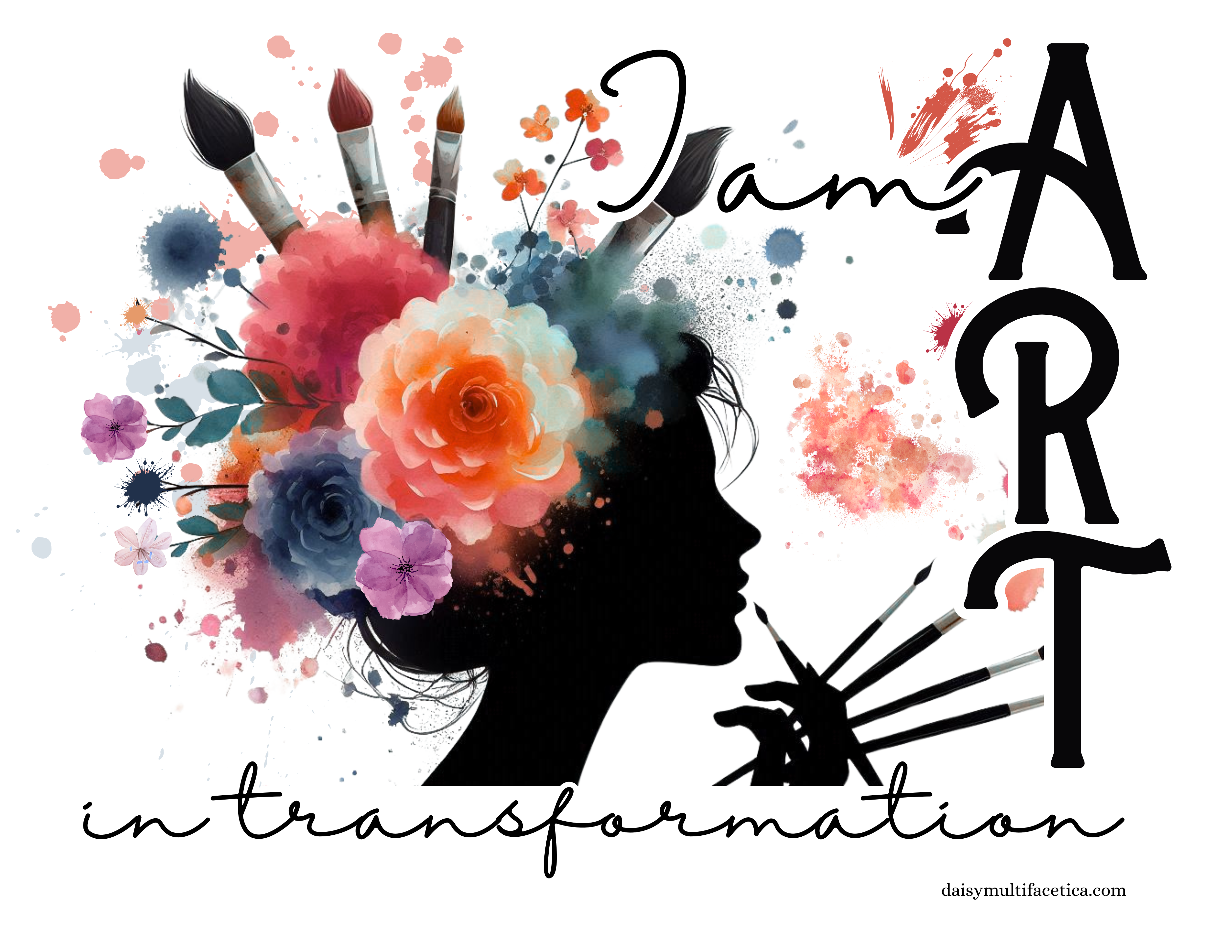 Las flores reflejan crecimiento y belleza interior, mientras que las pinceladas y las gotas de pintura representan la expresión artística y la libertad de creación. Es un recordatorio de que somos arte en movimiento, siempre cambiando, siempre floreciendo. 🎨✨